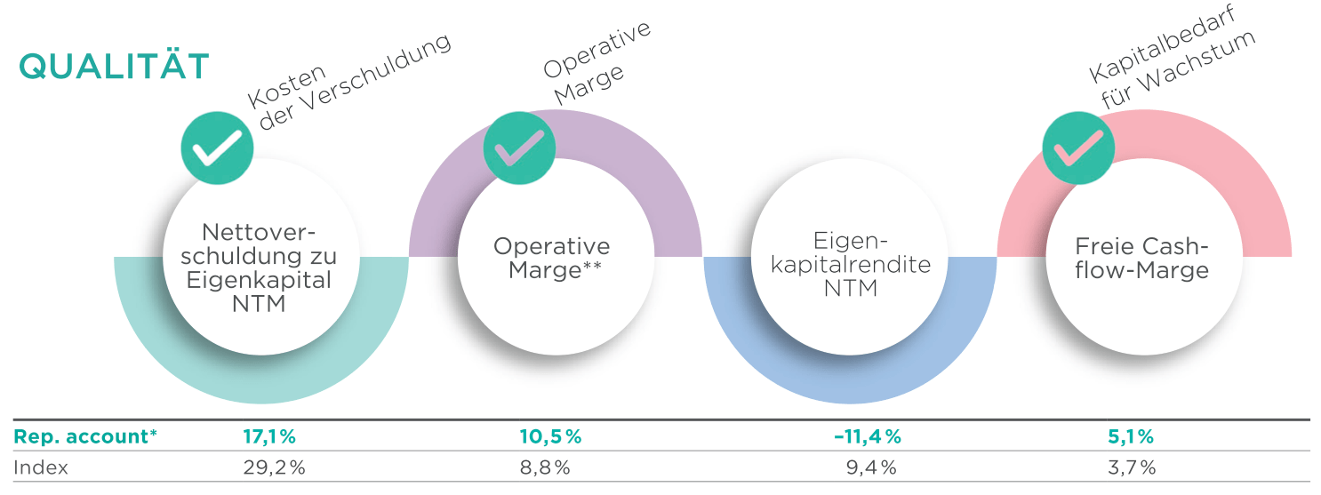 Gleichzeitig verbessern sich für die Unternehmen EPS-Wachstum und Margen: Wir betrachten unser Japan-Portfolio als ein Japan-Qualitätsportfolio – im Vergleich zum Index, insbesondere aufgrund der relativ niedrigen Fremdkapitalkosten (Nettoverschuldung zu Eigenkapital NTM), der besseren operativen Marge und Eigenkapitalrendite sowie der Free-Cashflow-Marge.