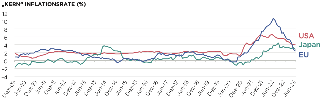 In Bezug auf Inflation und Zinssätze unterscheidet sich Japan weiterhin deutlich von anderen entwickelten Volkswirtschaften. Während die Inflation in Japan einen Höchststand von lediglich 4 % erreichte, liegt der Leitzins auch drei Jahre nach den Zinserhöhungen im Rest der Welt immer noch bei nur null Prozent.