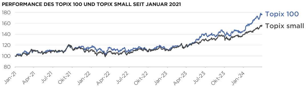 Die Wertentwicklung in der Vergangenheit lässt keine Rückschlüsse auf zukünftige Erträge zu. Die Erträge können aufgrund von Währungsschwankungen steigen oder fallen. Quelle: Comgest / FactSet-Finanzdaten und -Analysen, sofern nicht anders angegeben. Daten per 31. März 2024, ausgedrückt in JPY. Indizes: Topix 100-Kursrendite und Topix Small-Kursrendite. Die Indizes werden nur zu Vergleichszwecken herangezogen und der Fonds versucht nicht, die Indizes nachzubilden.