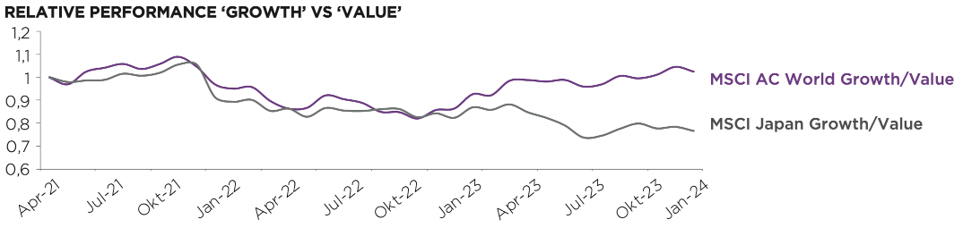 Die Wertentwicklung in der Vergangenheit lässt keine Rückschlüsse auf zukünftige Erträge zu. Die Erträge können aufgrund von Währungsschwankungen steigen oder fallen. Quelle: Comgest / FactSet-Finanzdaten und -Analysen, sofern nicht anders angegeben. Daten per 31. März 2024, ausgedrückt in JPY. Indizes: Topix GrowthGesamtertrag und Topix Value-Gesamtertrag. Die Indizes werden nur zu Vergleichszwecken verwendet und der Fonds versucht nicht, die Indizes nachzubilden.