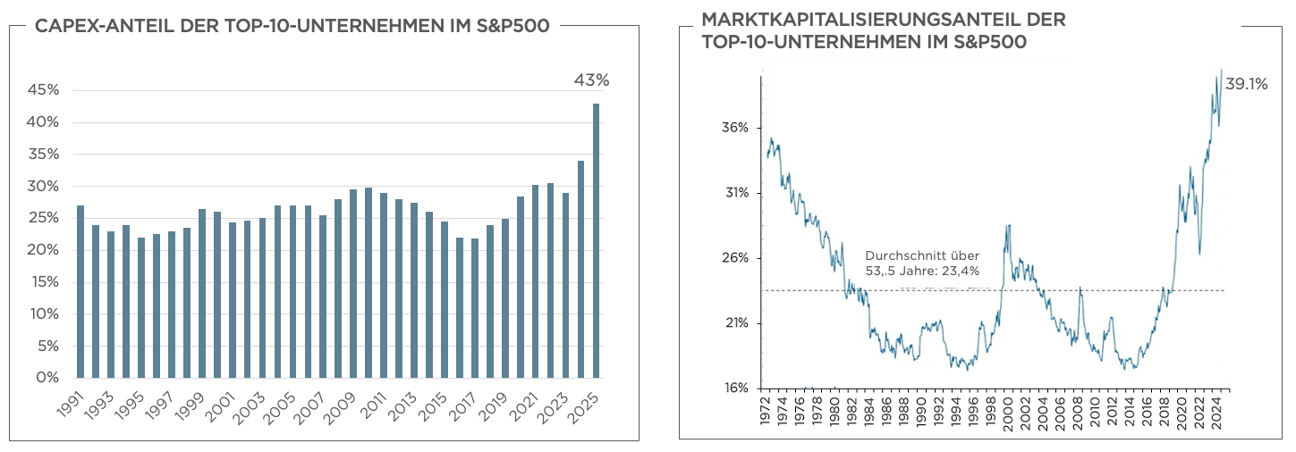 Gleichzeitig sind die Zuflüsse von Privatanlegern zwischen 2023 und 2025 um rund 50 % gestiegen. Diese Entwicklung hat die Märkte spürbar verändert und Phänomene wie Meme-Aktien begünstigt. Aus unserer Sicht spiegelt dieses Verhalten vor allem kurzfristiges Momentum-Denken und Herdenverhalten wider – nicht geduldige, langfristige Wertschöpfung. Hinzu kommt der starke Bedeutungszuwachs passiver Anlagestrategien: Ihr Anteil ist von rund 1 % der verwalteten Vermögen Anfang der 1990er-Jahre auf über 50% heute gestiegen. Auch dies hat aus unserer Sicht zur zunehmenden Marktkonzentration und zu höheren Bewertungen beigetragen, da unternehmensspezifische Fundamentaldaten weitgehend unberücksichtigt bleiben.