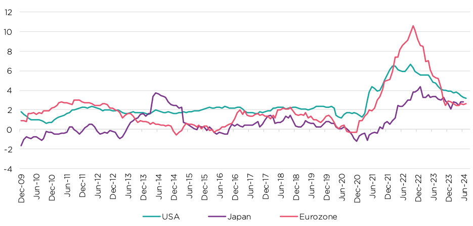 In Japan, the debate between value and growth investing has been heating up in recent years. Following the COVID-19 pandemic and Russia’s invasion of Ukraine, there was a worldwide resurgence of inflation and a resulting rise in interest rates, especially in the United States. Since 2021, while most developed economies followed the lead of the US and raised their interest rates to combat inflation, Japan stood out as an exception by deciding not to raise its interest rate.1 Japanese inflation peaked at just 4% in 2021, and its interest rate remained at zero until a surprise rate hike in July 2024, as shown in figure 1.