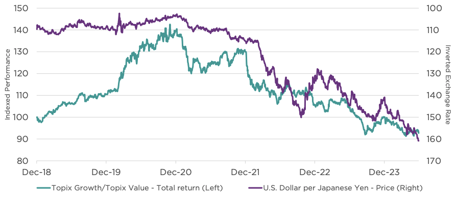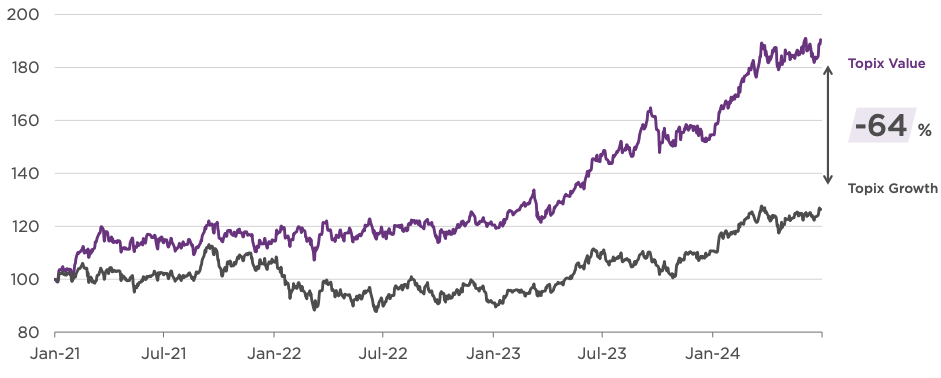 Source: Comgest / FactSet financial data and analytics, unless otherwise stated. Data as of 30-Jun-2024 expressed in JPY. Indices : Topix Growth – Total Return and Topix Value -Total Return. Indices are used for comparative purposes only and the Strategy does not seek to replicate the indices.