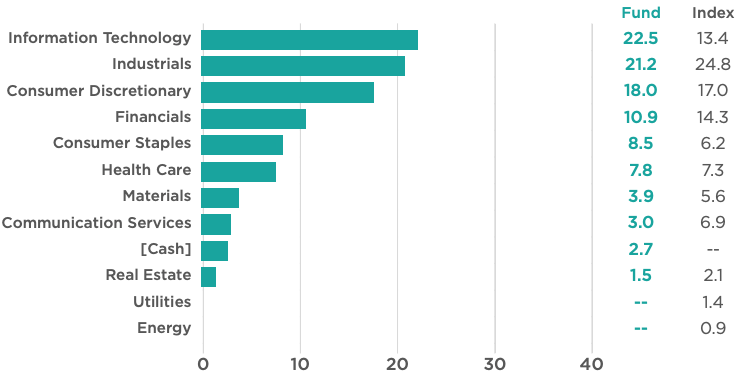Our strategy avoids cyclical sectors and instead focuses on sectors with long-term secular growth trends, such as Japan’s ageing society, digitisation, Asia’s growing market and productivity enhancers. During our engagements with Japanese companies, we typically discuss digital transformation and recovering consumer demand following the COVID-19 pandemic. The sector allocation of our Japanese equities strategy reflects these insights and trends, as shown in figure 4.