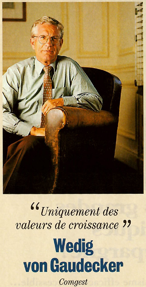Il primo colpo di fortuna di Comgest arriva quando l’ex datore di lavoro di von Gaudecker, per il quale aveva supervisionato il mandato svizzero, si trovò in difficoltà. Ciò offrì a von Gaudecker l’opportunità di fare rete, il che lo portò ad essere presentato a una società che stava lavorando con successo con gestori di portafoglio basati negli Stati Uniti (e che ha scoperto guru finanziari del calibro di George Soros e Michael Steinhardt). Dopo essersi assicurato un posto nella nuova divisione di gestione di portafoglio dell'azienda, un piccolo intoppo nella comunicazione a von Gaudecker sulla disponibilità dei fondi porta a un fortuito ritardo di due settimane, consentendogli di sfruttare una flessione del mercato per acquistare a buon mercato, facendo guadagnare a Comgest un vantaggio significativo e un rapido incremento degli asset da gestire.